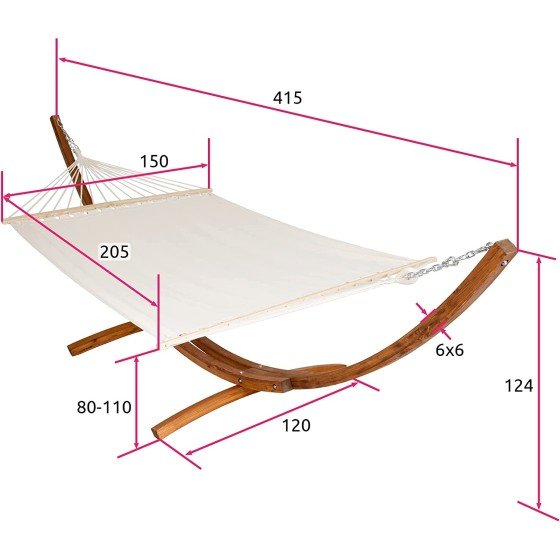 Materiaali: tekstiilikangas koostumus: riippumatto 65% puuvillaa, 35% polyesteriä; runko öljytystä havupuusta; ruuvit, koukut ja ketjut ruostumattomasta teräksestä